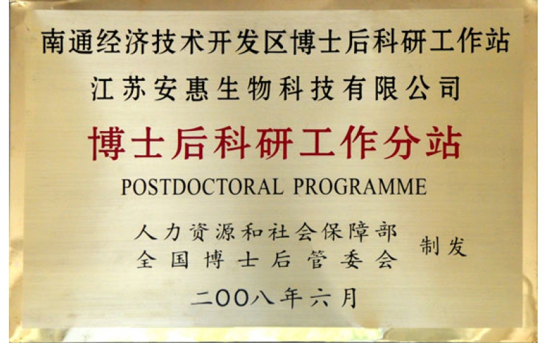 2008年10月15日,安惠公司接受國(guó)家人力資源部、社會(huì)保障局、全國(guó)博士后管委會(huì)聯(lián)合制發(fā)的“博士后科研工作分站”銅牌。