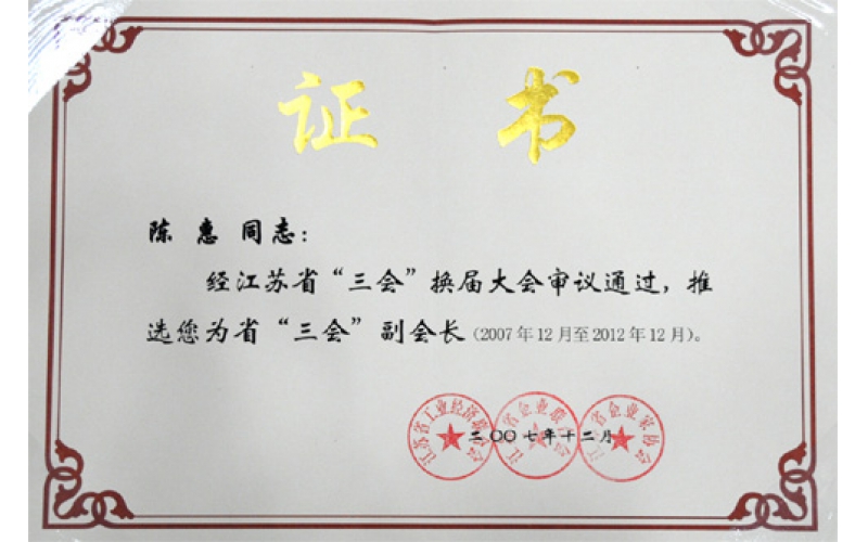 2007年12月,陳惠董事長當選“三會”(江蘇省工業(yè)經(jīng)濟聯(lián)合會、江蘇省企業(yè)聯(lián)合會、江蘇省企業(yè)家協(xié)會)副會長。