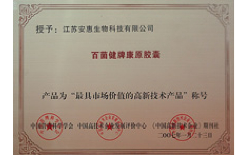 2007年1月24日,安惠百菌健牌康原膠囊產(chǎn)品獲得中國(guó)管理科學(xué)學(xué)會(huì)、中國(guó)高技術(shù)企業(yè)發(fā)展評(píng)價(jià)中心、中國(guó)高新技術(shù)企業(yè)期刊社聯(lián)合評(píng)定的“最具市場(chǎng)價(jià)值的高新技術(shù)產(chǎn)品”榮譽(yù)稱號(hào)。同時(shí),百菌健牌康原膠囊還與公司的另一產(chǎn)品——靈芝孢子蟲(chóng)草菌絲體粉攜手獲得“江蘇省名牌產(chǎn)品”榮譽(yù)稱號(hào)。