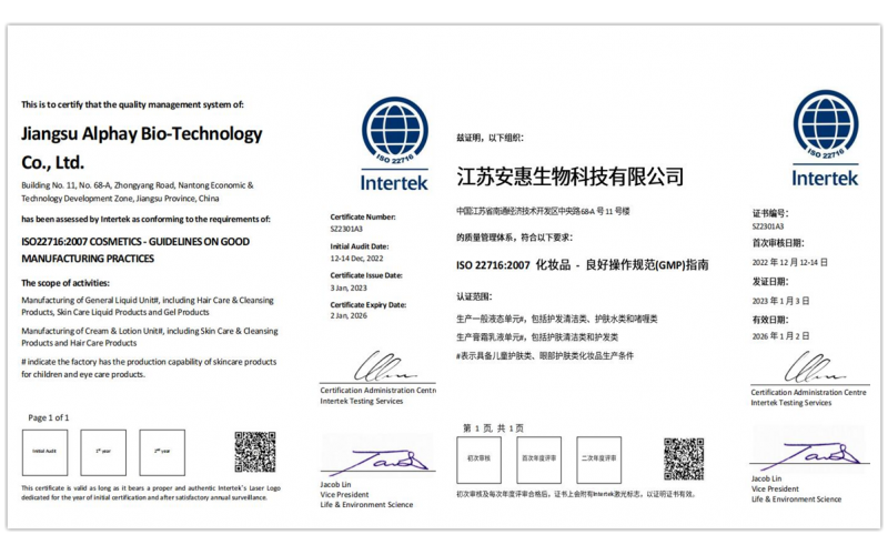 2023年1月,安惠公司化妝品生產(chǎn)系統(tǒng)順利通過認證公司Intertek的嚴格審核,獲得ISO22716質(zhì)量管理體系認證,即國際化妝品GMP認證。化妝品GMP管理系統(tǒng)的目標是通過對生產(chǎn)流程中的每項工作、每個環(huán)節(jié)和每道工序都進行高標準的規(guī)范和要求,消除和防止產(chǎn)品在制造過程中的質(zhì)量缺陷,避免化妝品產(chǎn)品對使用者的潛在危險;GMP認證的最大優(yōu)點是證實生產(chǎn)企業(yè)的廠房、人員、設施、材料的采購和使用及產(chǎn)品制造過程控制、工廠和人員衛(wèi)生管理、質(zhì)量管理體系均達到了世界先進水平。