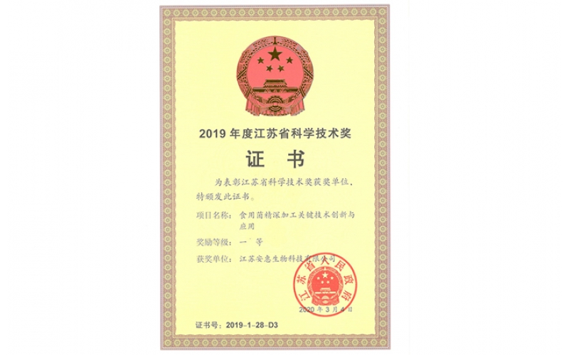 2020年3月,由江蘇安惠生物科技有限公司參與南京財經(jīng)大學、南京農(nóng)業(yè)大學、中國農(nóng)業(yè)大學等科研院所承擔的食用菌精深加工關(guān)鍵技術(shù)創(chuàng)新與應用榮獲江蘇省科學技術(shù)獎一等獎。